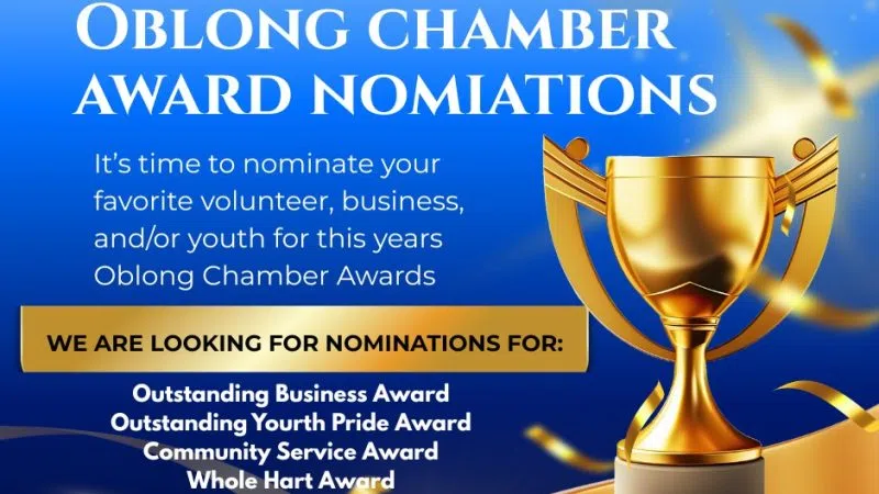 (Oblong) -- This is the final week to submit Oblong Chamber Award Nominations. Chamber President, Angie Catt, says they are seeking nominations for the "Outstanding Business Award," "Outstanding Youth Pride Award," "Community Service Award," and "Whole Heart Award." Nomination fo...