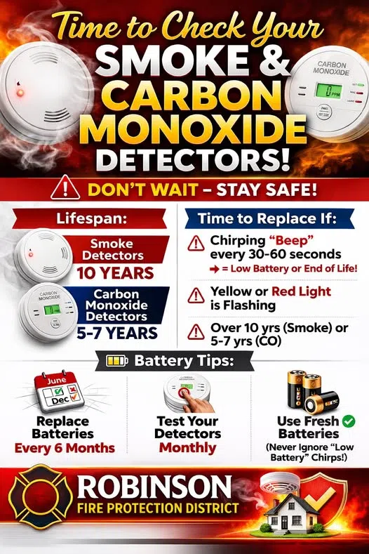 (Undated) – The time change is this weekend, and once again, fire officials say it’s a great time to check your smoke detectors and CO alarms. The Robinson Fire Protection District reminds residents to test, inspect, and replace any broken or expired smoke and CO alarms. They say smoke alarms with “non-replaceable 10-year batteries” are designed to remain effective for up to 10 years. If the alarm chirps, warning that the battery is low, replace the entire smoke alarm right away. They say carbon monoxide detectors typically have a five to seven-year life span. Detectors with any type of “replaceable” batteries need a new battery at least once a year. However, they recommend replacing batteries every six months.